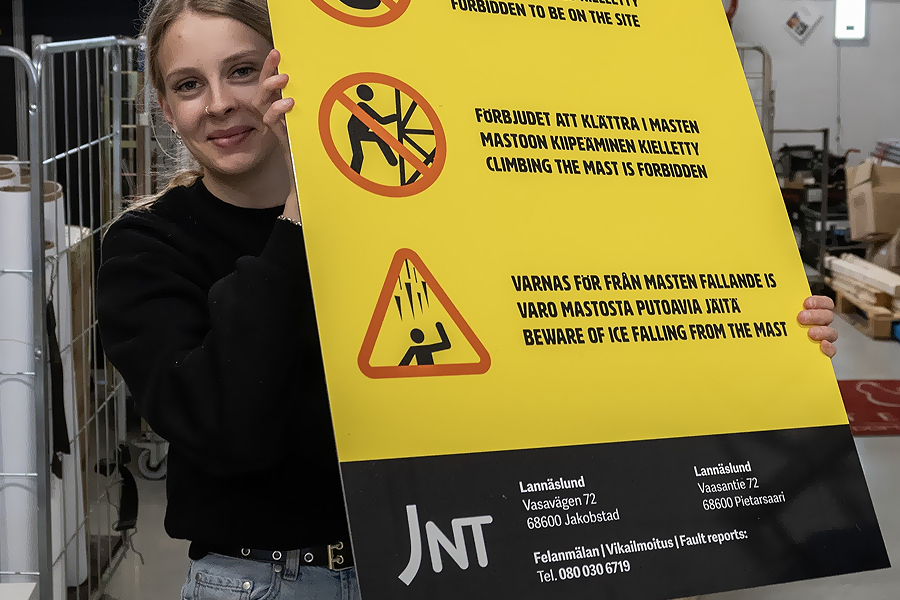 Roikkuvat kyltit ja vahvat mainostaulut. Tavall. ulkokyltti, liikennekyltti tai sisäkyltti paikoissa jossa ilkivallan vaara.
