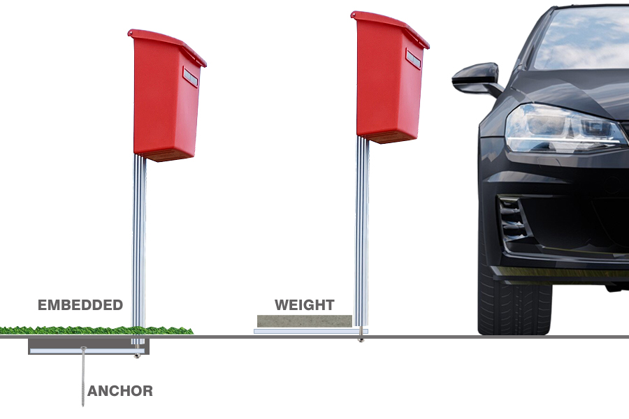 Ulkomalli toimitetaan 100cm korkealla ALU-4 tolpalla sekä neliöjalalla. Painoksi suosittelemme 1-2kpl, 30x30cm pihalaattaa koville alustoille. Ulkokäytössä postilaatikkotelineen teräsjalka voidaan myös upottaa maahan ja peittää.